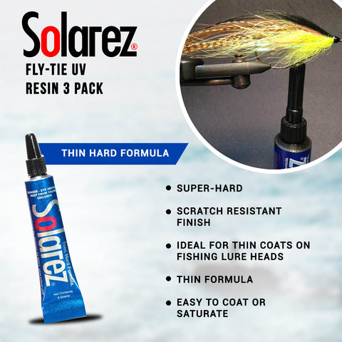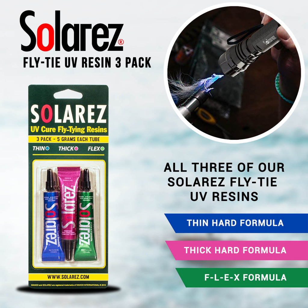 All three of our Solarez fly-tie UV resins. Each comes in a 5-gram tube (1/10 oz) with applicator tip – ample for many lures.