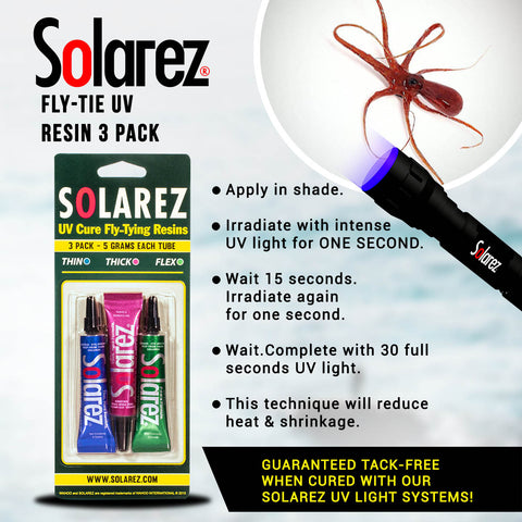 All three instantly cure with a hard, tack-free finish with sunlight or our Solarez UV flashlights.