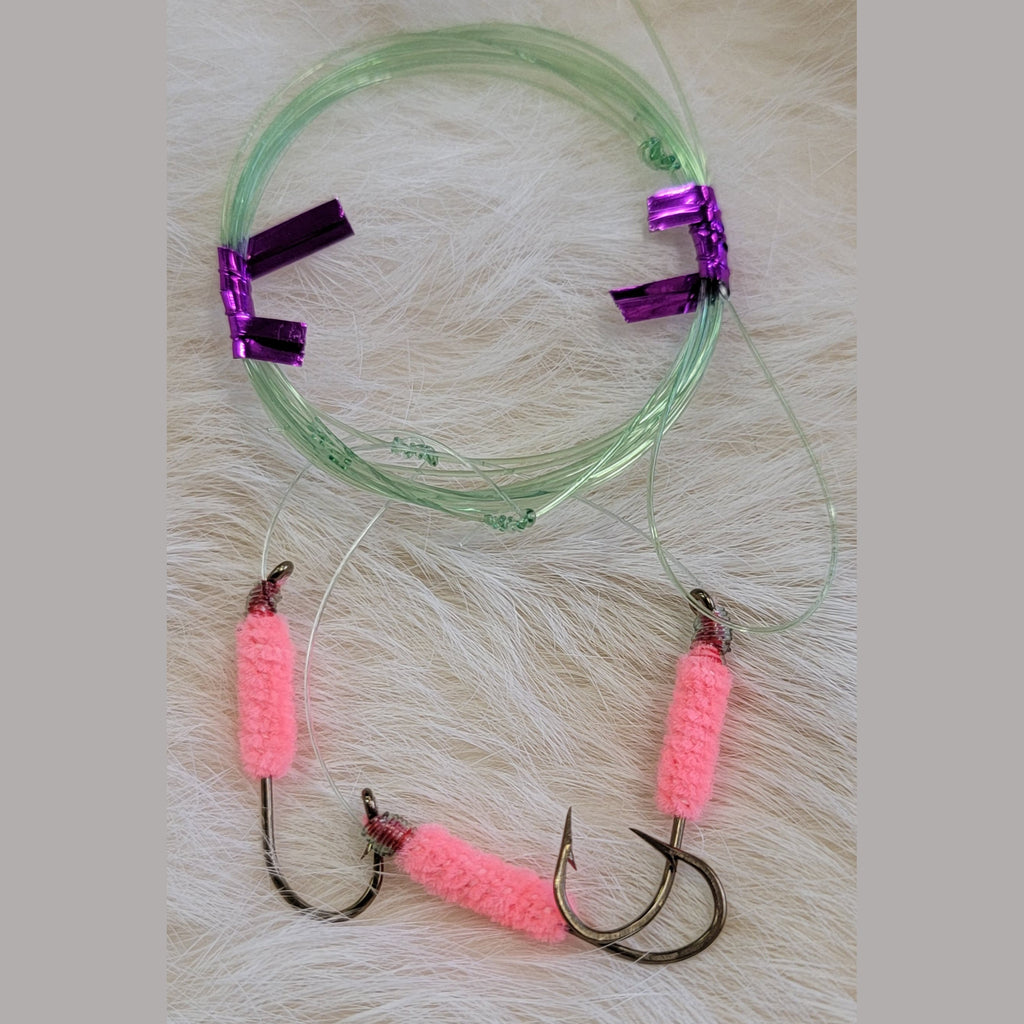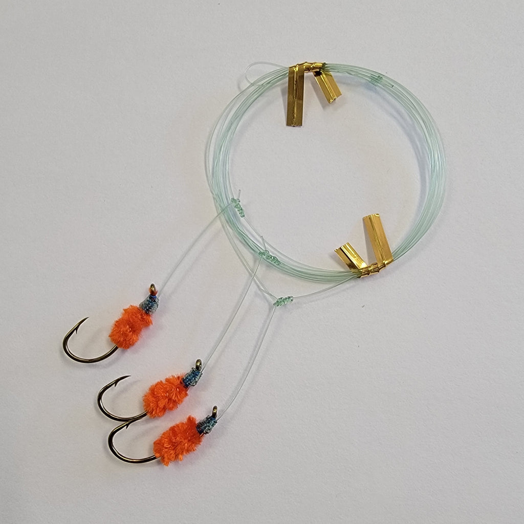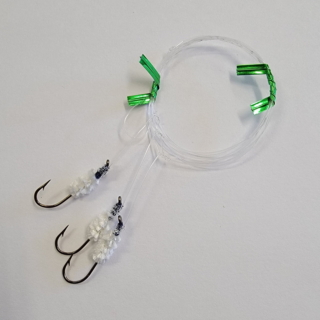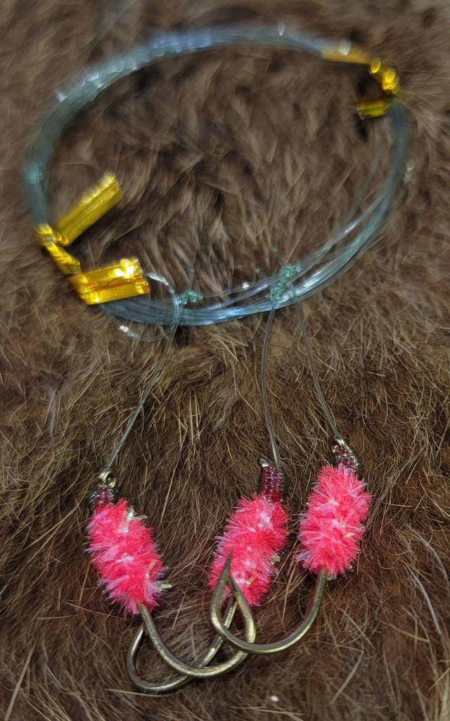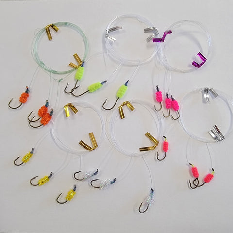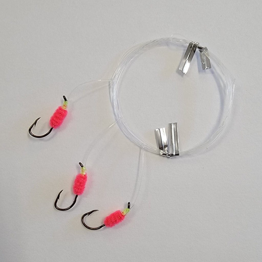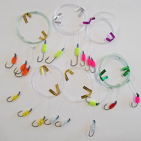Chenille and thread colors may vary slightly. Hook sizes range in size. Leader may be clear or ultragreen. Examples of these differences are all shown in the group pictures.