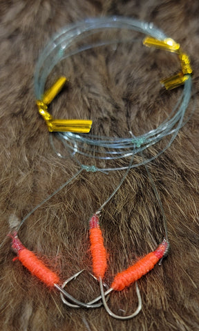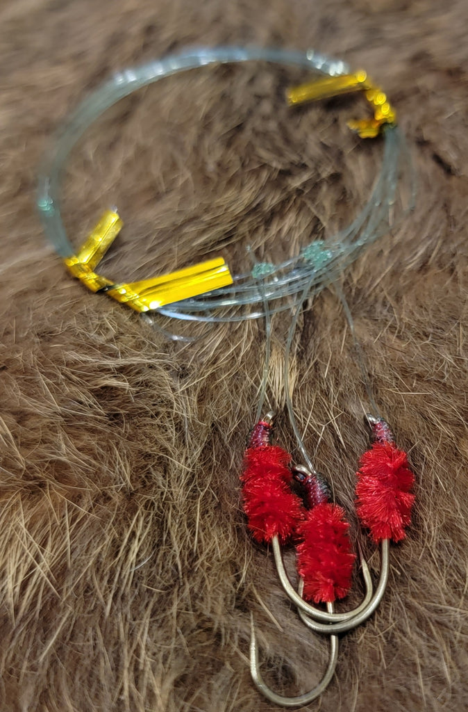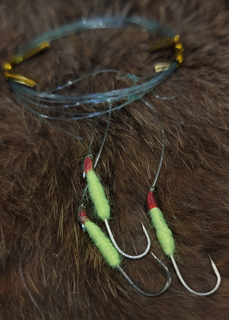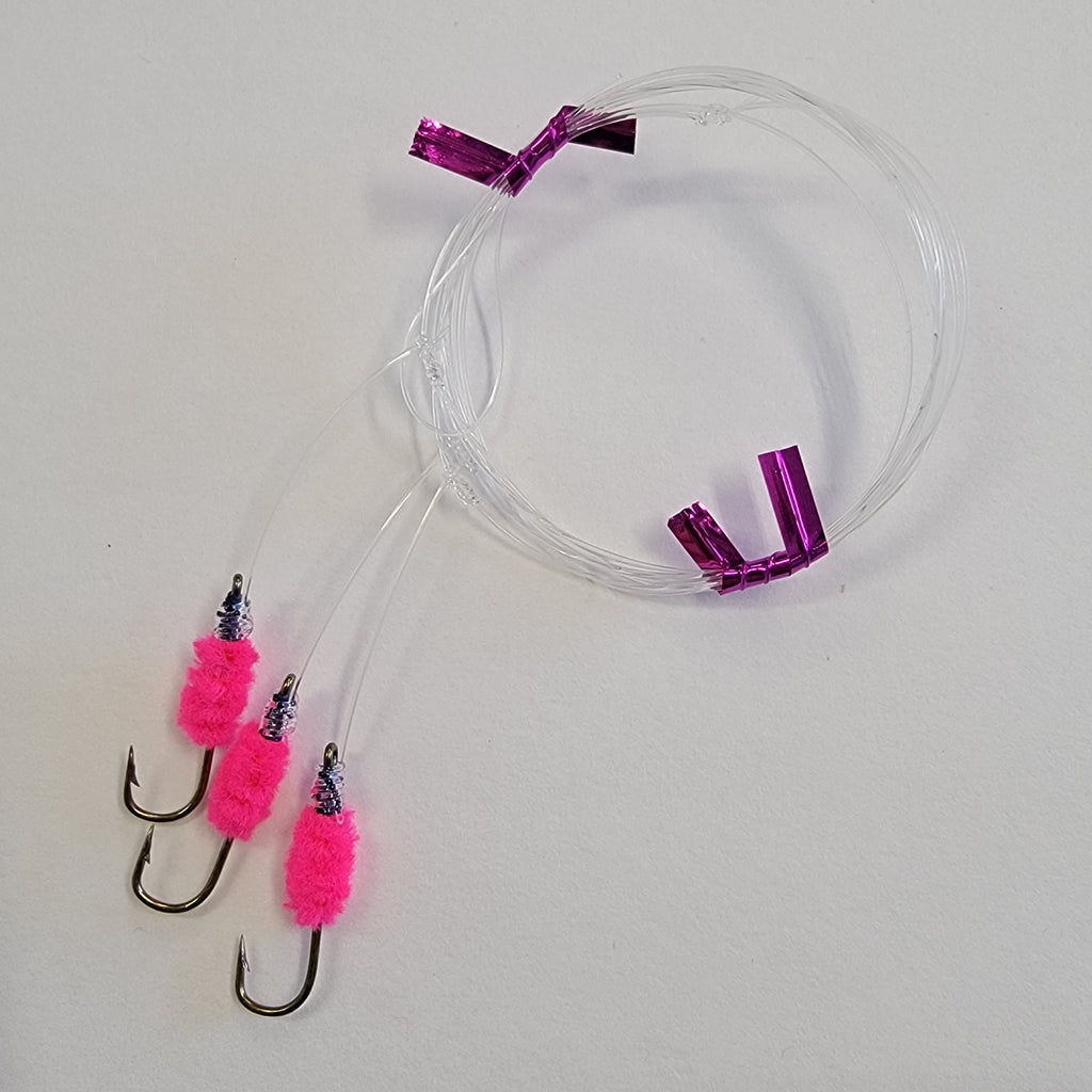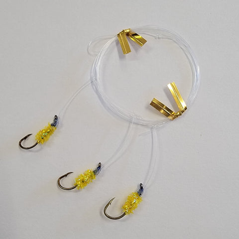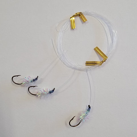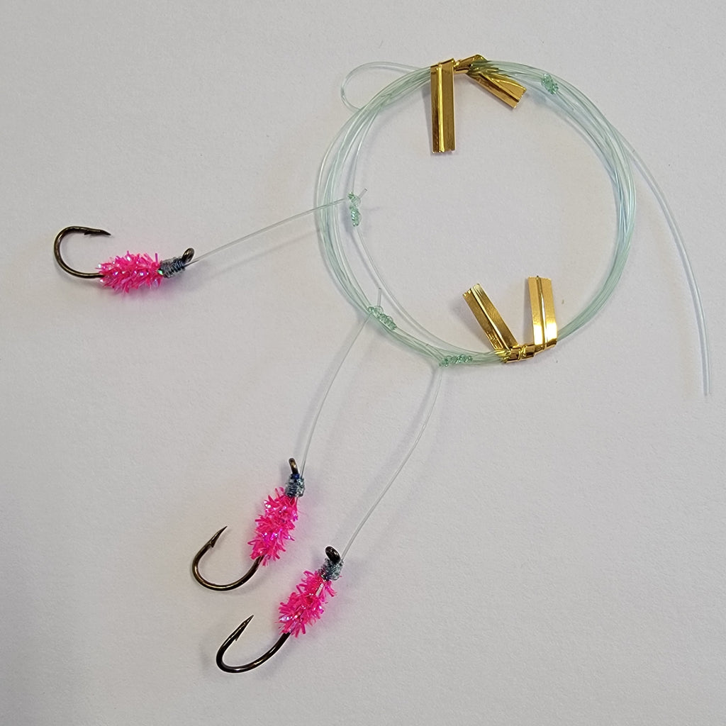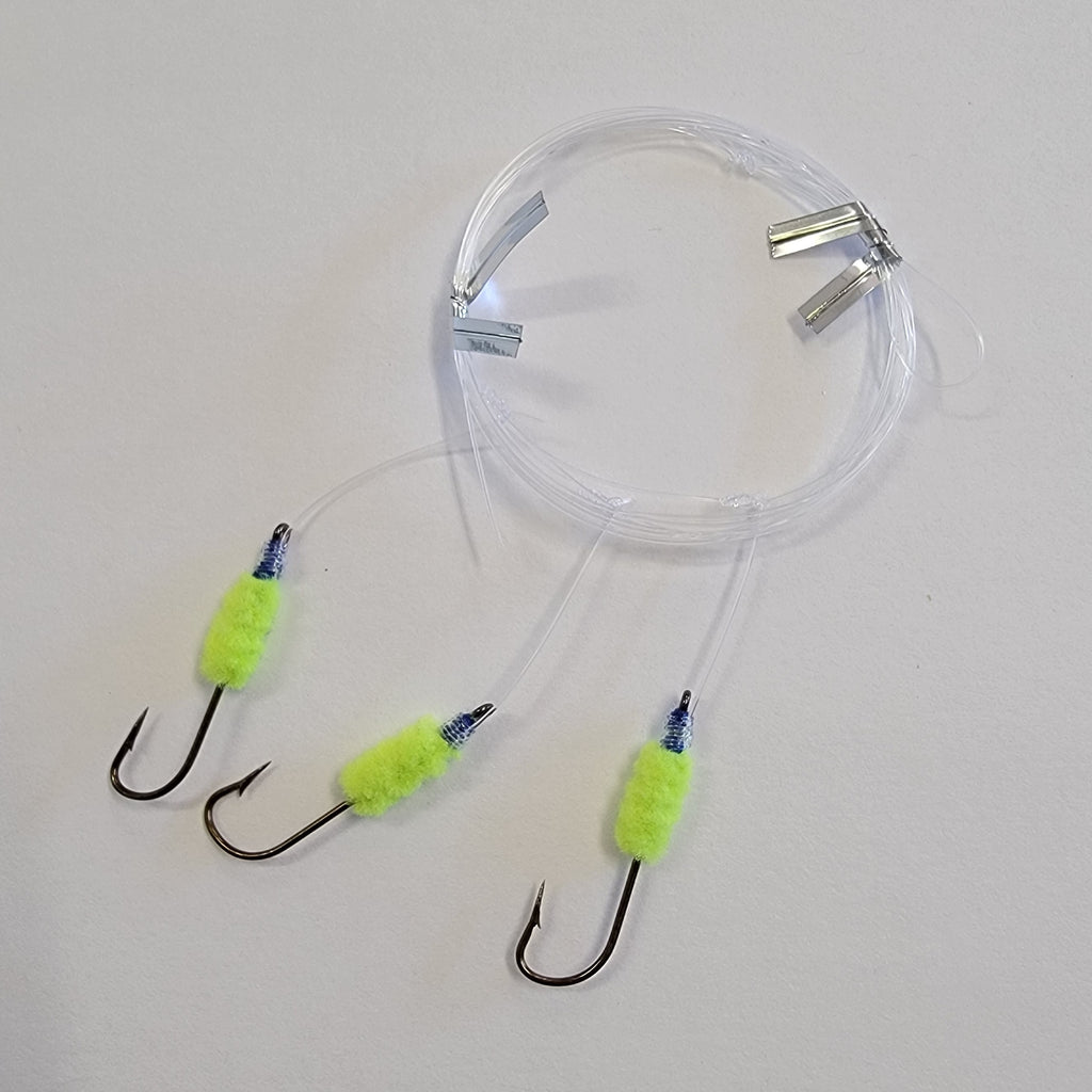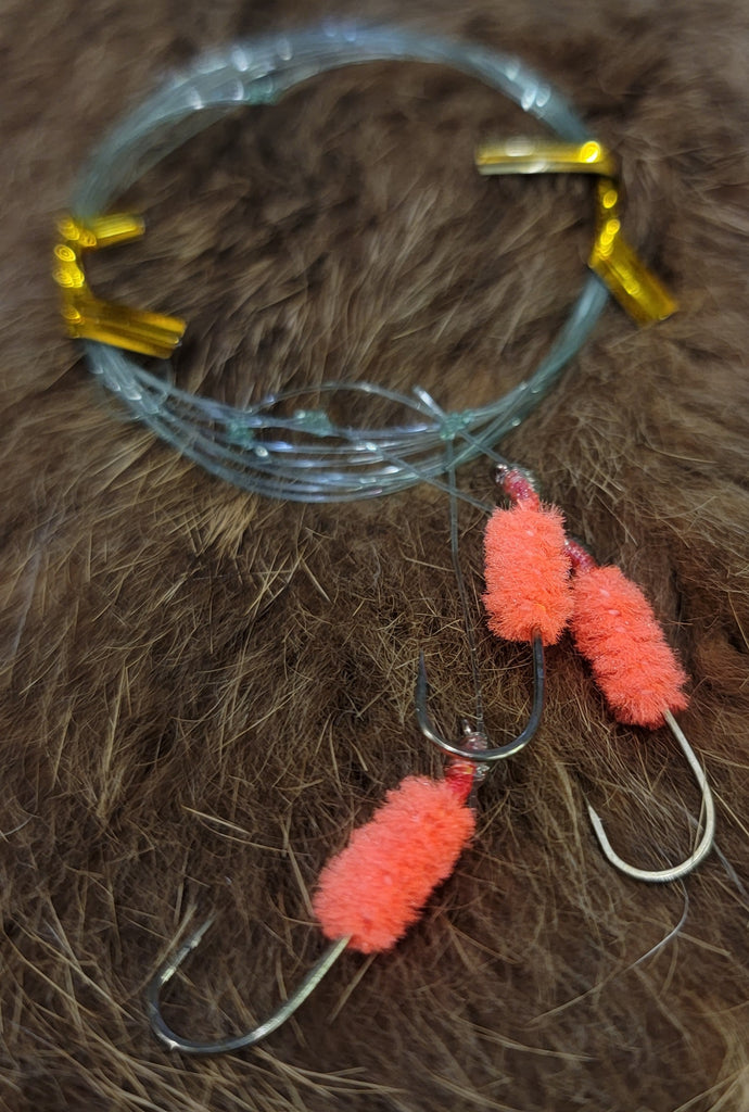 Chenille and thread colors may vary slightly. Hook sizes range in size. Leader may be clear or ultragreen. Examples of these differences are all shown in the group pictures.