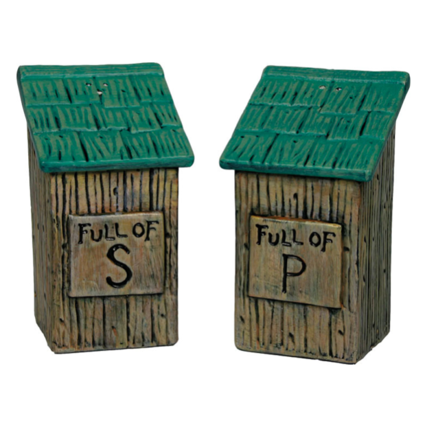 These outhouse salt and pepper shakers from River's Edge Products are sold as a matching pair and will be a welcome addition to your dining room table. These salt and pepper shakers are made of ceramic and are painted to resemble a pair of outhouses. Marked with an S and P for easy identification so you'll never be mistaken when you season your food. These shakers come in a protective clear PVC box. The Outhouse and Pepper Shakers will allow you to season your meal with style.