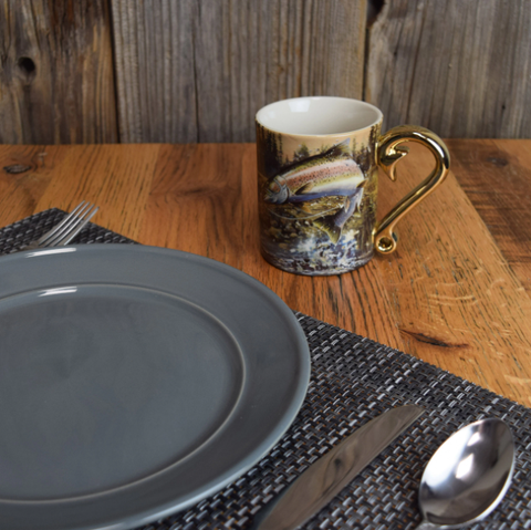 This rainbow trout scene 3D ceramic mug by River's Edge Products is ideal for any outdoor enthusiast. Drink your morning coffee, tea, hot chocolate, or other beverage out of this highly detailed mug. It features a three-dimensional design of a rainbow trout leaping out of the water that wraps completely around the mug. Its impressive artwork extends to the hand painted handle sculpted to resemble a shiny brass fish hook. Due to the metallic finish on the handle, do not microwave. Hand washing this mug is recommended to help keep the design looking its best. This mug will make a great gift for your outdoors-loving friends, family members, or colleagues. The rainbow trout scene 3D ceramic mug combines function with flair so you can enjoy the beauty of wildlife whenever you take a coffee break.