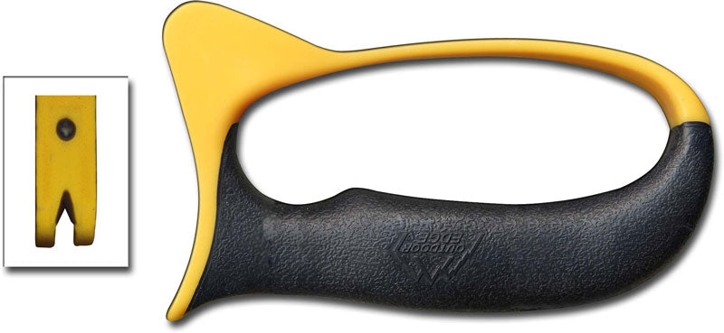 Reshapes a razor-sharp cutting edge on any knife in seconds. Simply draw the sharpener over the blade 3-4 times and you are ready to go. Tungsten carbide V-shaped bits are set at a universal 22 degree angle for extreme sharpness. The carbide bits are removable and reversible for twice the life and can be easily replaced. The rubberized TPR handle ensures a safe, non-slip grip at all times.