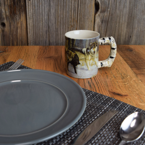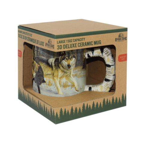This wolf scene 3D ceramic mug by River's Edge Products is ideal for any outdoor enthusiast. Drink your morning coffee, tea, hot chocolate, or other beverage out of this highly detailed mug. It features a three-dimensional design of a wolf pack in the snow that wraps completely around the mug. Its impressive artwork extends to the hand painted handle sculpted to resemble an aspen tree trunk. This mug is microwave safe so you can keep your drink warm. Hand washing this mug is recommended to help keep the design looking its best. This mug will make a great gift for your outdoors-loving friends, family members, or colleagues. The wolf scene 3D ceramic mug combines function with flair so you can enjoy the beauty of wildlife whenever you take a coffee break.